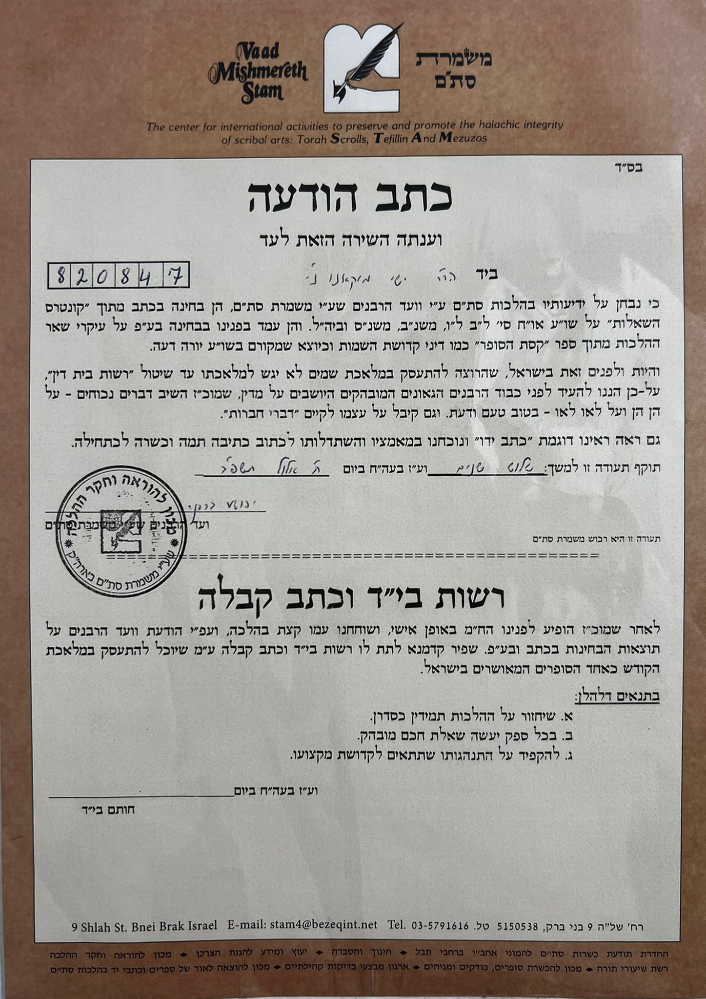 I am a certified Sofer STaM (scribe of Torah scrolls, tefillin, and mezuzot), holding a valid Sofer certification from recognized institutes such as Mishmeret STaM, Yad Rafael, and Lishkat HaKodesh.